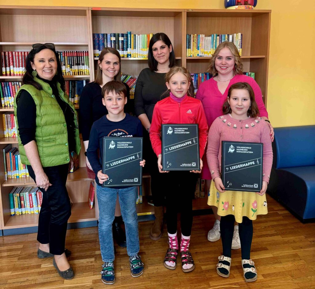 Im März 2025 fand in der Volksschule Hainburg die Übergabe der brandneuen Liedermappen der Raiffeisenbank Carnuntum an den Schulchor „Donauspatzen“ statt.