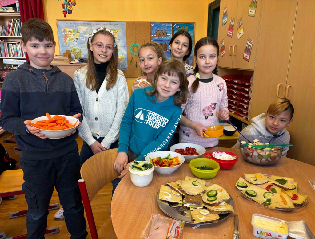Auch die Zubereitung der Snacks, das Streichen und Belegen der Brote, das Schälen der Eier, das Schneiden der Gemüsesticks und der Zutaten für den Obstsalat machte den Schülern sichtlich Spaß. Die Lehrerin der Klasse, Frau Petra David, nutzte die Gelegenheit, um den Kindern die Bedeutung einer ausgewogenen Ernährung näherzubringen und ihnen zu zeigen, wie wichtig es ist, auf die eigene Gesundheit zu achten.